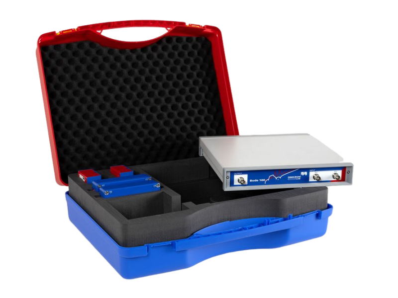 A colorful box for the Bode Analyzer featuring a custom cut-out foam interior. It is designed to hold a Bode Anaylzer including cables, the power supply and up to 4 accessories.